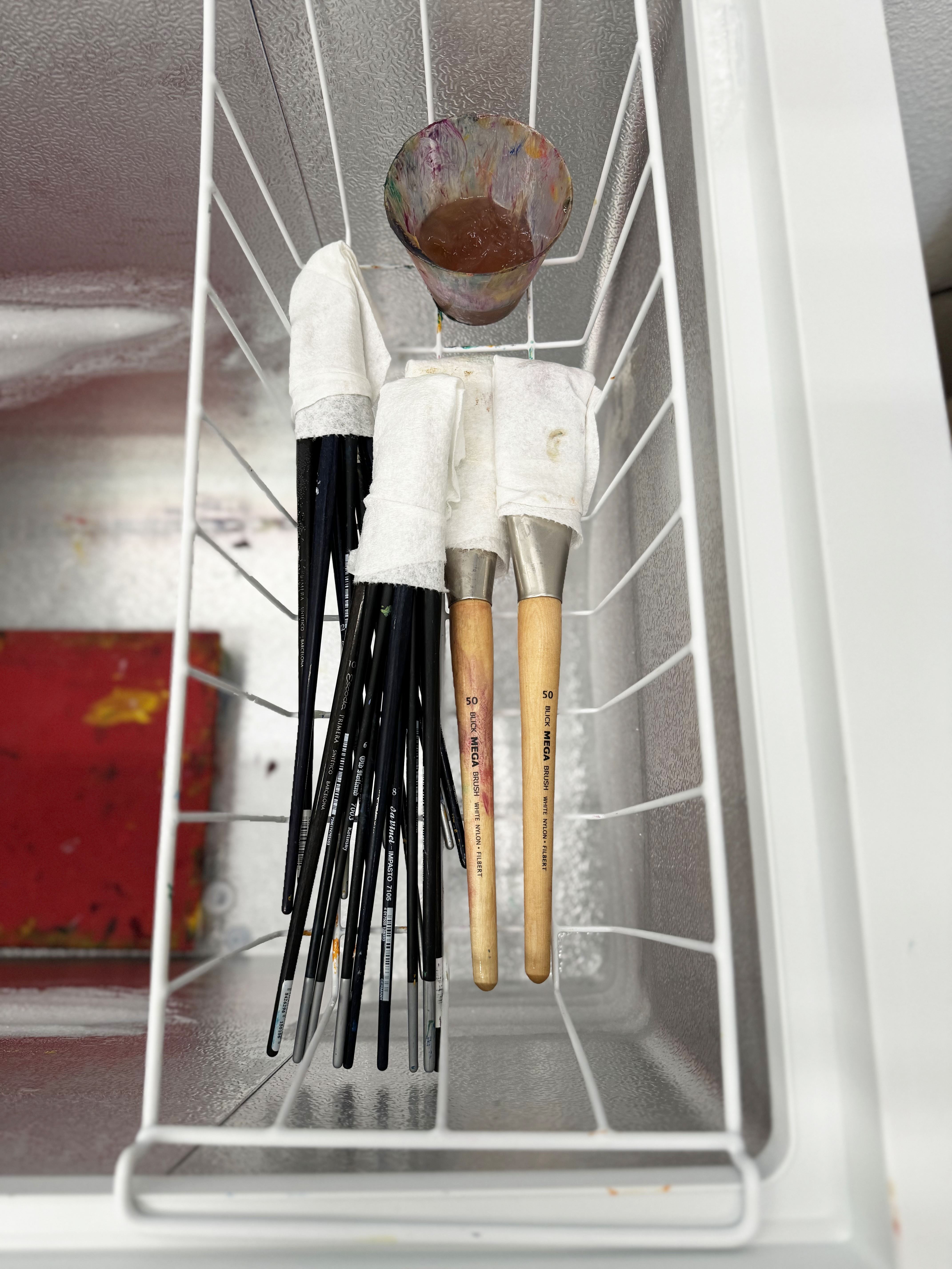 When I am done painting for the day, I wrap my brushes tightly in a paper towel and place them in the freezer, along with my entire paint palette. My brushes last for weeks without cleaning by storing them in the freezer at night.