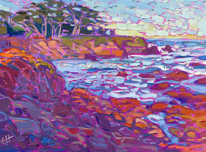 Discover Erin Hanson's coastal painting collection, and dive into the deep waters of her swirling, vibrant colors. Many of Erin's pieces were inspired by California's diverse and colorful coastline from San Diego to the Monterey Peninsula and continuing up Highway 1 to Mendocino. She has also been inspired by the coastlines of the northwest, and also the rocky coast of Acadia National Park. Erin Hanson uses thick brush strokes and impressionistic movement of the paint to capture the swirling layers of foam and crashing waves. Her coastal works often include wind-sculpted cypress trees, rocky cliffsides, coastal wildflowers, and sunset skies.