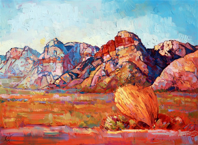 Erin Hanson developed her open impressionist style of painting (and rock climbing) among the red rock cliffs of Nevada's desertscapes. The state is known for foreboding desert landscapes, red rocks, and of course, Las Vegas. Hanson not only depicts many of the state's conservation areas including Valley of Fire and Red Rock Canyon, but she also shares views of lesser-known buttes and rock formations found throughout the state.