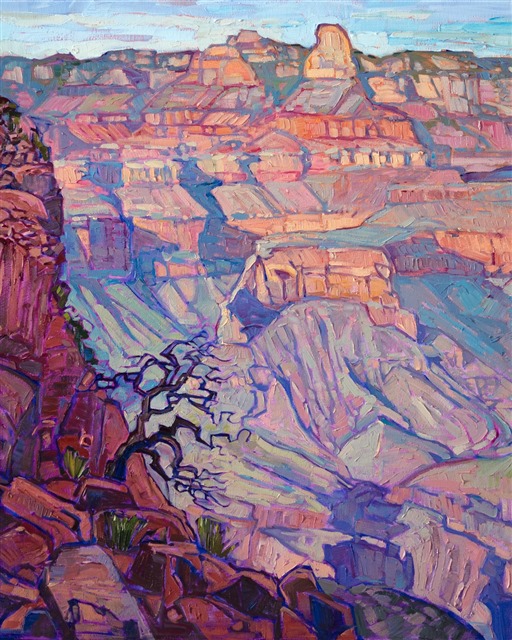 Soft, late morning light illuminates the other side of the Grand Canyon, seen from the South Kaibab trail. The impasto brush strokes in this oil painting are loose and impressionistic, alive with color and motion.