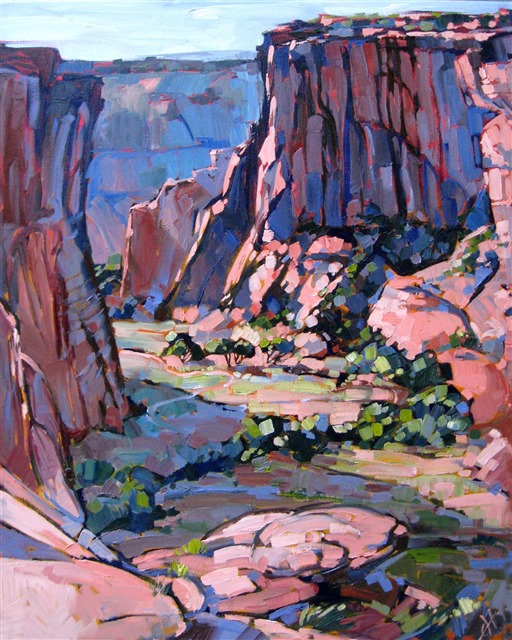ERIN HANSON has been painting in oils since she was 8 years old. As a teenager, she apprenticed at a mural studio where she worked on 40-foot-long paintings while selling art commissions on the side. After being told it was too hard to make a living as an artist, she got her degree in Bioengineering from UC Berkeley. Afterward, Erin became a rock climber at Red Rock Canyon, Nevada. Inspired by the colorful scenery she was climbing, she decided to return to her love of painting and create one new painting every week.