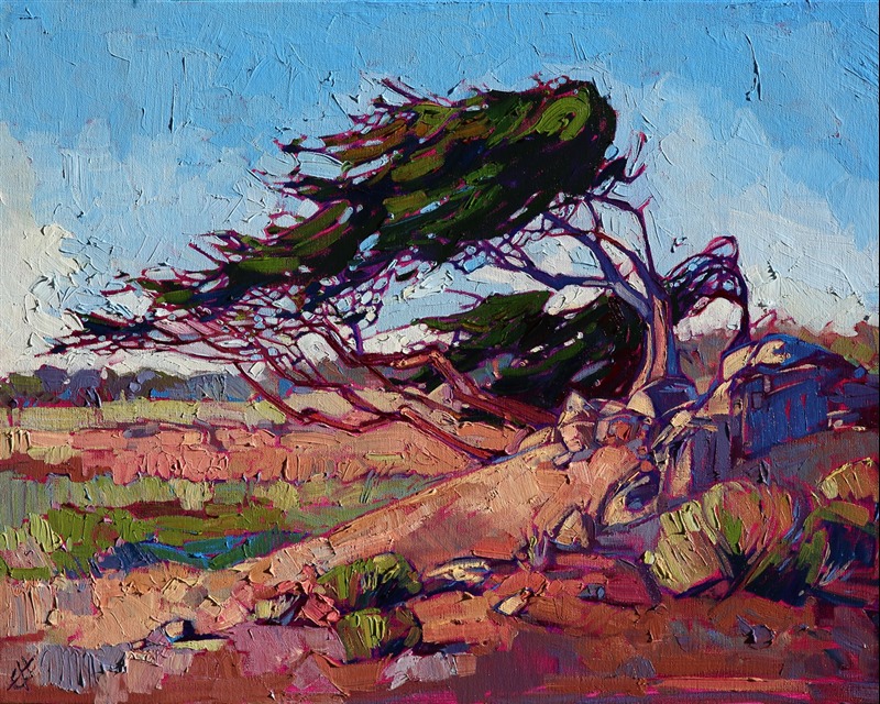 Low, wispy cypress trees brush the sky above Monterey, California. The light is calm and peaceful in this painting, transporting you to the beautiful beaches of the Monterey peninsula.