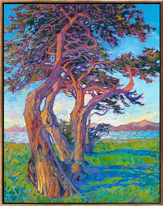 A grove of wind-carved cypress trees stands on the tip of the Monterey Peninsula, near Lover's Point. The dawn light casts rich, warm hues of golden orange across the coastal landscape. Each impressionist brush stroke is thick and impasto, alive with color and energy.