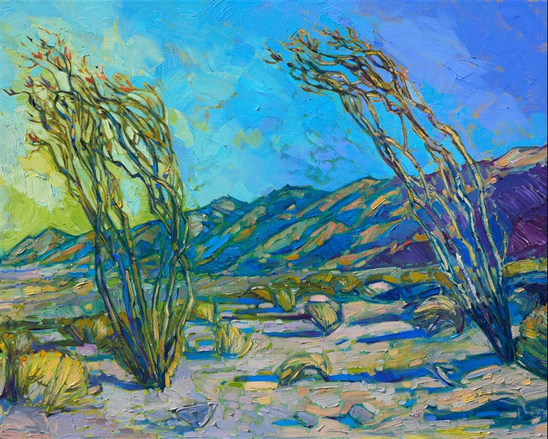 This painting captures everything I love about the desert: unexpected color, swiftly changing light, and rainbow-hued mountains. When I love a landscape I am painting, the brush strokes come fast and sure, capturing the vibrancy and motion that I feel when I am out-of-doors.