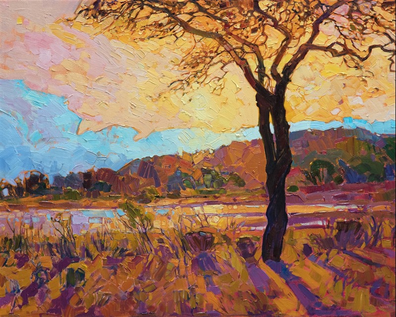 Note on varnishing: Erin’s paintings take six to eight weeks to dry, at which time we apply a retouching varnish, which allows the painting to complete the curing process while having a layer of protection against dirt and scuffs. The full curing process for an impasto oil painting takes at least two years. We are happy to assist in applying a final finishing varnish to your Erin Hanson oil painting once it has been dry for at least two years. Here is more information on how to care for your original oil painting.