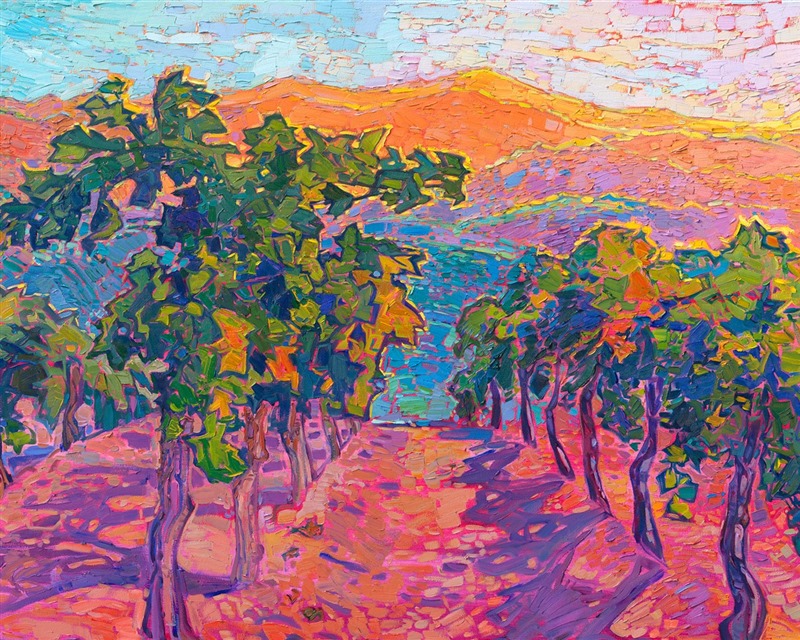 Note on varnishing: Erin’s paintings take six to eight weeks to dry, at which time we apply a retouching varnish, which allows the painting to complete the curing process while having a layer of protection against dirt and scuffs. The full curing process for an impasto oil painting takes at least two years. We are happy to assist in applying a final finishing varnish to your Erin Hanson oil painting once it has been dry for at least two years. Here is more information on how to care for your original oil painting.