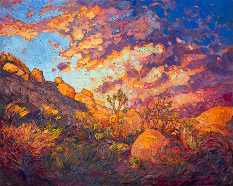Joshua Tree National Park is hit with vibrant colors of sunset in this modern impressionist painting. The white granite boulders are perfect reflectors of color. Each brush stroke in this painting is filled with motion and life, forming a mosaic of light across the canvas.