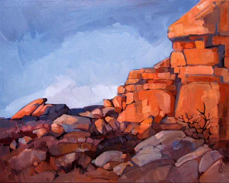 ERIN HANSON has been painting in oils since she was 8 years old. As a teenager, she apprenticed at a mural studio where she worked on 40-foot-long paintings while selling art commissions on the side. After being told it was too hard to make a living as an artist, she got her degree in Bioengineering from UC Berkeley. Afterward, Erin became a rock climber at Red Rock Canyon, Nevada. Inspired by the colorful scenery she was climbing, she decided to return to her love of painting and create one new painting every week.