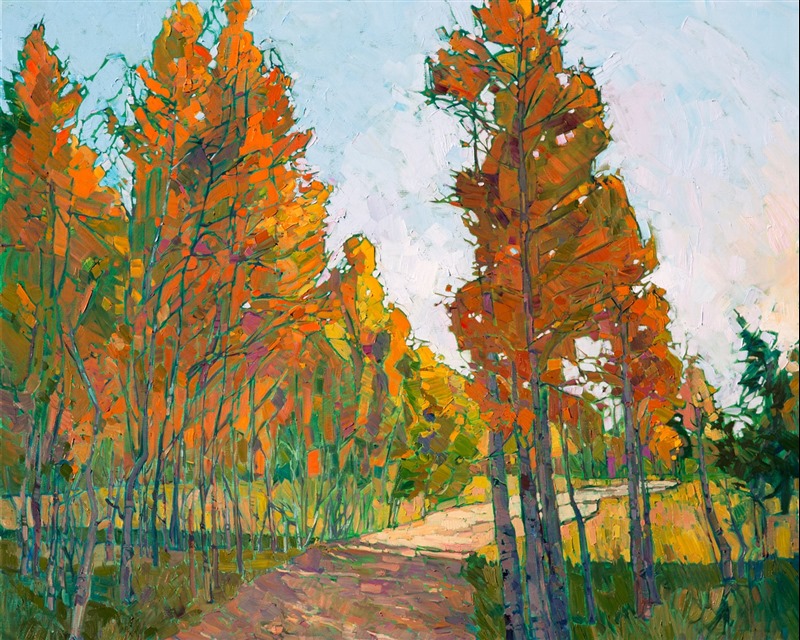 Style: "Open Impressionism" is a new style of painting developed by American artist Erin Hanson. The style is characterized by short, impasto brush strokes that are applied without layering, creating a mosaic or stained-glass appearance to the paintings. The paintings are created with a limited palette of colors, applied without blending or mixing upon the canvas, which adds a dimension of texture to each brush stroke. Inspired by classic impressionism, pointillism, and post-impressionism, Erin Hanson continues the tradition of impressionism into the modern day with her colorful and vivacious landscape paintings.