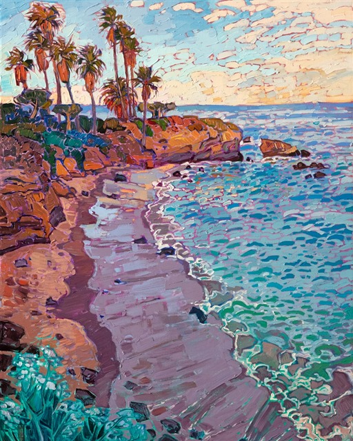"La Jolla Dawn" was created on 1-1/2" canvas, with the painting continued around the edges. The piece arrives framed in a 23kt contemporary gold floater frame.