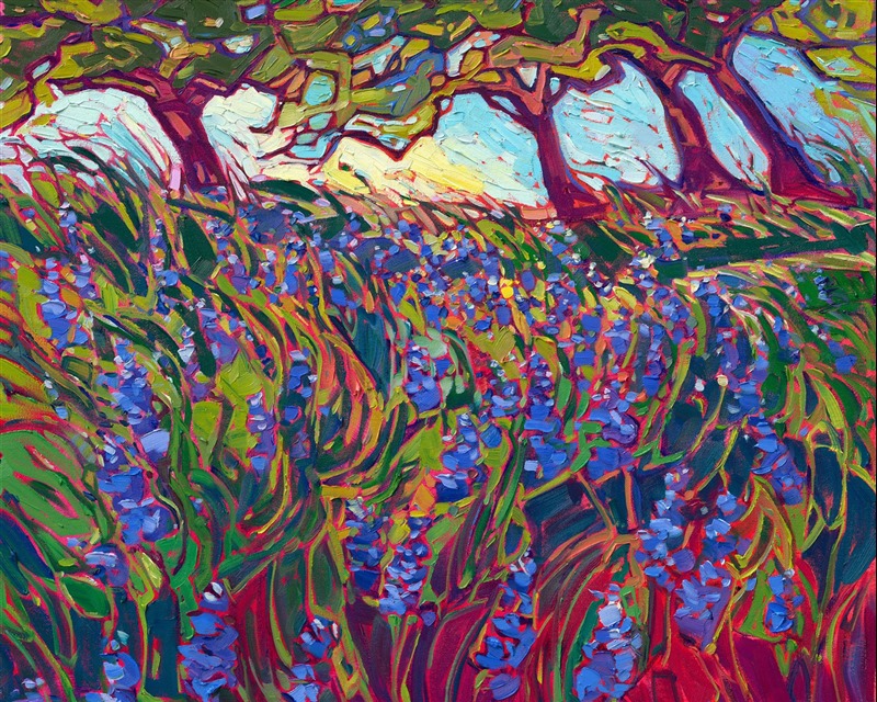 A lush field of lupin blooms spreads across the grassy ground beneath the overhanging oak trees. The bright purple flowers are a beautiful contrast against the green. Each impressionistic brush stroke adds texture and movement to the painting.