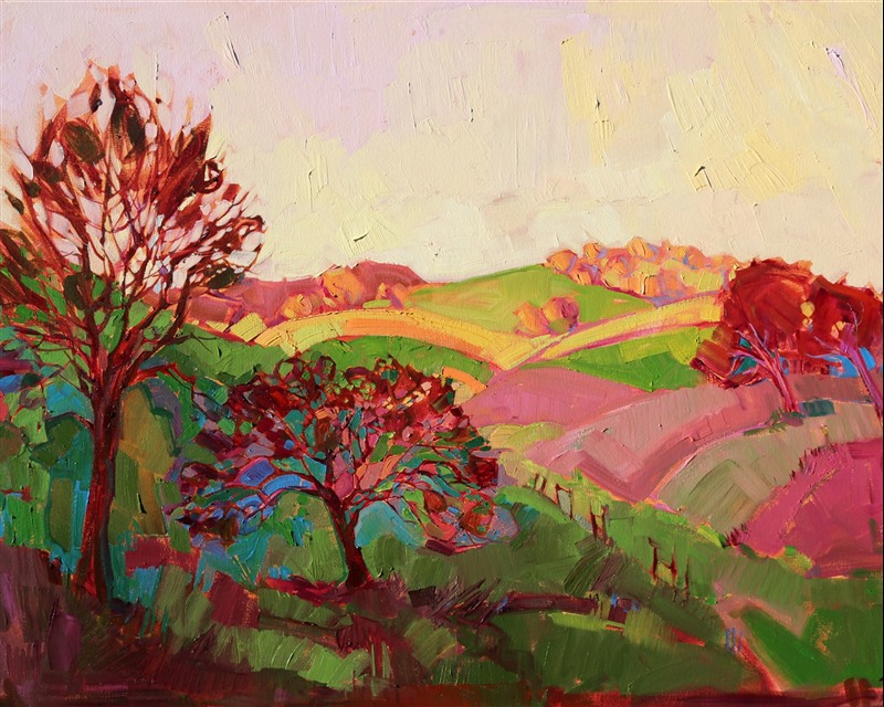Style: "Open Impressionism" is a new style of painting developed by American artist Erin Hanson. The style is characterized by short, impasto brush strokes that are applied without layering, creating a mosaic or stained-glass appearance to the paintings. The paintings are created with a limited palette of colors, applied without blending or mixing upon the canvas, which adds a dimension of texture to each brush stroke. Inspired by classic impressionism, pointillism, and post-impressionism, Erin Hanson continues the tradition of impressionism into the modern day with her colorful and vivacious landscape paintings.