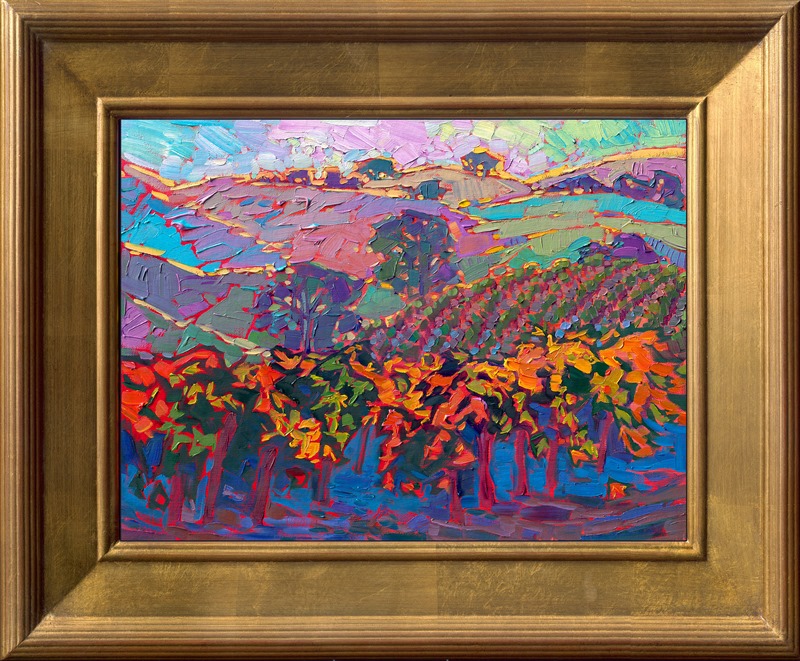 Note on varnishing: Erin’s paintings take six to eight weeks to dry, at which time we apply a retouching varnish, which allows the painting to complete the curing process while having a layer of protection against dirt and scuffs. The full curing process for an impasto oil painting takes at least two years. We are happy to assist in applying a final finishing varnish to your Erin Hanson oil painting once it has been dry for at least two years. Here is more information on how to care for your original oil painting.