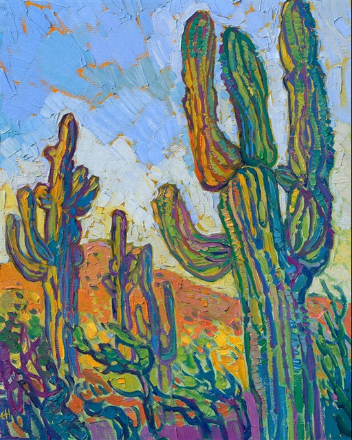 "Saguaro Glow" is an original oil painting on linen board. This piece arrives framed in a custom-made plein air frame (mock floater style, so the edges are uncovered). This painting will be displayed at The Erin Hanson Gallery in McMinnville as part of her annual Petite Show.