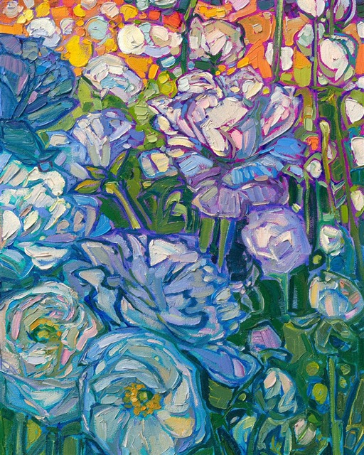 This oil painting captures the colors of spring with thick, impressionistic brush strokes. The layers of contrasting blooms create a sense of movement and excitement within the piece. Erin Hanson's modern style of painting is called Open Impressionism, and it involves placing brush strokes side-by-side, without layering. The effect is a stained-glass or mosaic look to her oil paintings.