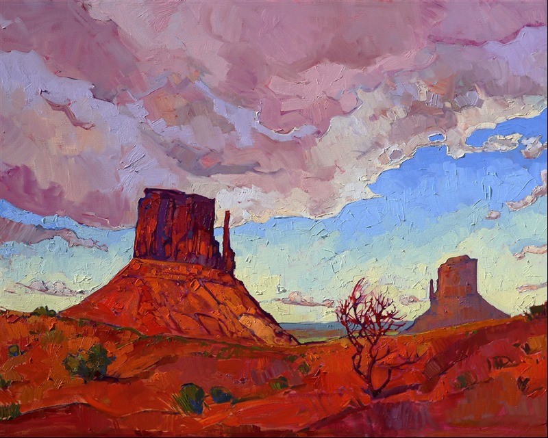 Monument Valley's iconic mittens are painted in all their bold glory, with dramatic clouds bursting across the sky. The brush work in this painting is spontaneous and intriguing, adding another dimension to the painting that pulls you further into the landscape, as seen by the artist's eye.