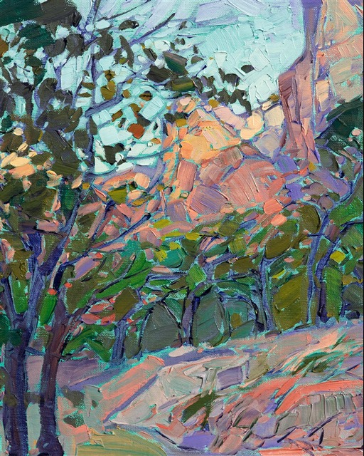 Style: "Open Impressionism" is a new style of painting developed by American artist Erin Hanson. The style is characterized by short, impasto brush strokes that are applied without layering, creating a mosaic or stained-glass appearance to the paintings. The paintings are created with a limited palette of colors, applied without blending or mixing upon the canvas, which adds a dimension of texture to each brush stroke. Inspired by classic impressionism, pointillism, and post-impressionism, Erin Hanson continues the tradition of impressionism into the modern day with her colorful and vivacious landscape paintings.