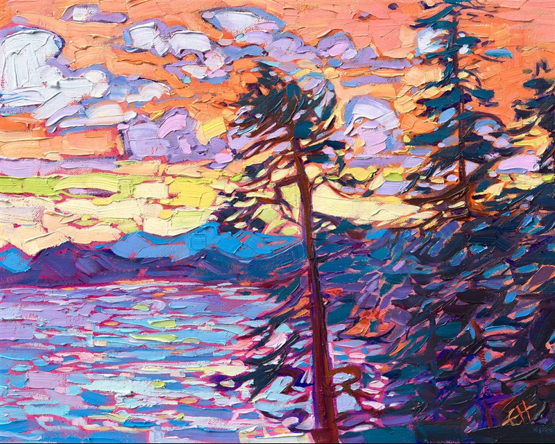 Note on varnishing: Erin’s paintings take six to eight weeks to dry, at which time we apply a retouching varnish, which allows the painting to complete the curing process while having a layer of protection against dirt and scuffs. The full curing process for an impasto oil painting takes at least two years. We are happy to assist in applying a final finishing varnish to your Erin Hanson oil painting once it has been dry for at least two years. Here is more information on how to care for your original oil painting.