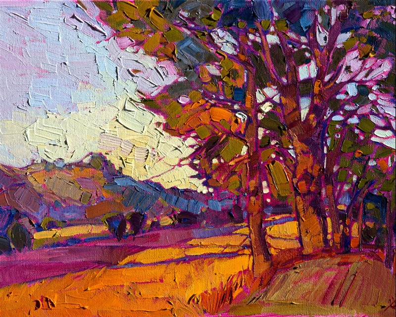 Style: "Open Impressionism" is a new style of painting developed by American artist Erin Hanson. The style is characterized by short, impasto brush strokes that are applied without layering, creating a mosaic or stained-glass appearance to the paintings. The paintings are created with a limited palette of colors, applied without blending or mixing upon the canvas, which adds a dimension of texture to each brush stroke. Inspired by classic impressionism, pointillism, and post-impressionism, Erin Hanson continues the tradition of impressionism into the modern day with her colorful and vivacious landscape paintings.