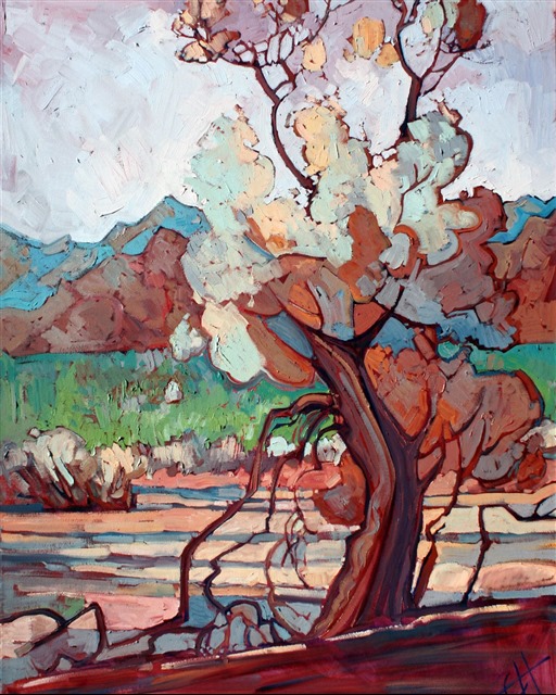 Style: "Open Impressionism" is a new style of painting developed by American artist Erin Hanson. The style is characterized by short, impasto brush strokes that are applied without layering, creating a mosaic or stained-glass appearance to the paintings. The paintings are created with a limited palette of colors, applied without blending or mixing upon the canvas, which adds a dimension of texture to each brush stroke. Inspired by classic impressionism, pointillism, and post-impressionism, Erin Hanson continues the tradition of impressionism into the modern day with her colorful and vivacious landscape paintings.