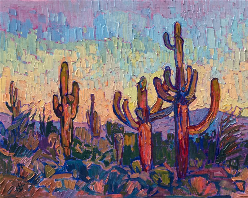 This painting captures the stately saguaro north of Scottsdale, Arizona. The early morning light casts warm shades of sherbet across the prickly landscape.