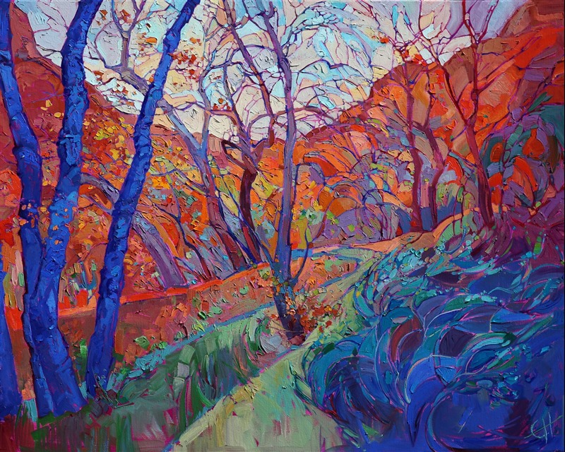 Autumn afternoons in Zion National Park bring rich blue and violet shadows to life, their cool colors bright against the distant red rock cliffs. This painting conveys the mood of Zion in the fading autumn light, the lush brush work both evocative and mesmerizing.