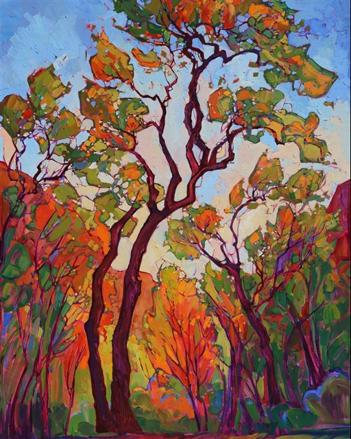 Style: "Open Impressionism" is a new style of painting developed by American artist Erin Hanson. The style is characterized by short, impasto brush strokes that are applied without layering, creating a mosaic or stained-glass appearance to the paintings. The paintings are created with a limited palette of colors, applied without blending or mixing upon the canvas, which adds a dimension of texture to each brush stroke. Inspired by classic impressionism, pointillism, and post-impressionism, Erin Hanson continues the tradition of impressionism into the modern day with her colorful and vivacious landscape paintings.