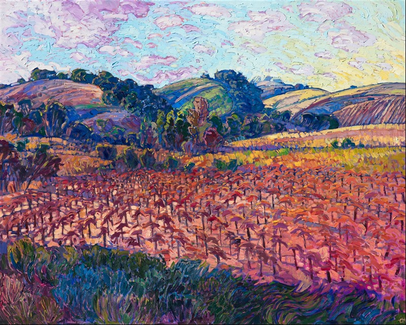 The rich, warm colors of autumn spread across this vineyards scene from central California. The vivid reds and yellow seem to glow upon the canvas. Each brush stroke is loose and impressionistic, bringing a sense of motion and vibrancy to the painting.