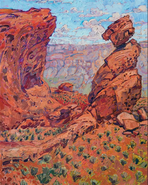 ERIN HANSON has been painting in oils since she was 8 years old. As a teenager, she apprenticed at a mural studio where she worked on 40-foot-long paintings while selling art commissions on the side. After being told it was too hard to make a living as an artist, she got her degree in Bioengineering from UC Berkeley. Afterward, Erin became a rock climber at Red Rock Canyon, Nevada. Inspired by the colorful scenery she was climbing, she decided to return to her love of painting and create one new painting every week.