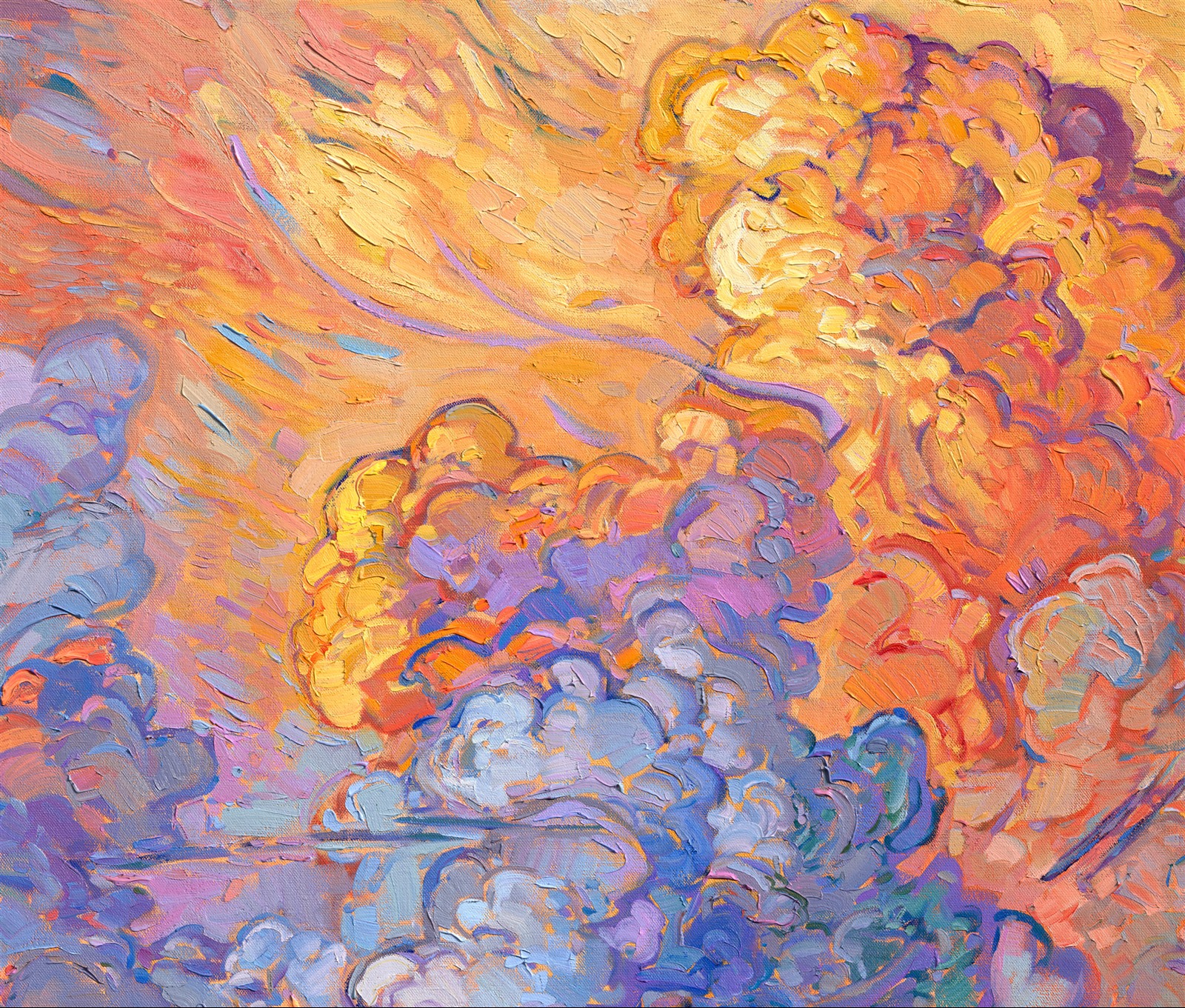 Note on varnishing: Erin’s paintings take six to eight weeks to dry, at which time we apply a retouching varnish, which allows the painting to complete the curing process while having a layer of protection against dirt and scuffs. The full curing process for an impasto oil painting takes at least two years. We are happy to assist in applying a final finishing varnish to your Erin Hanson oil painting once it has been dry for at least two years. Here is more information on how to care for your original oil painting.