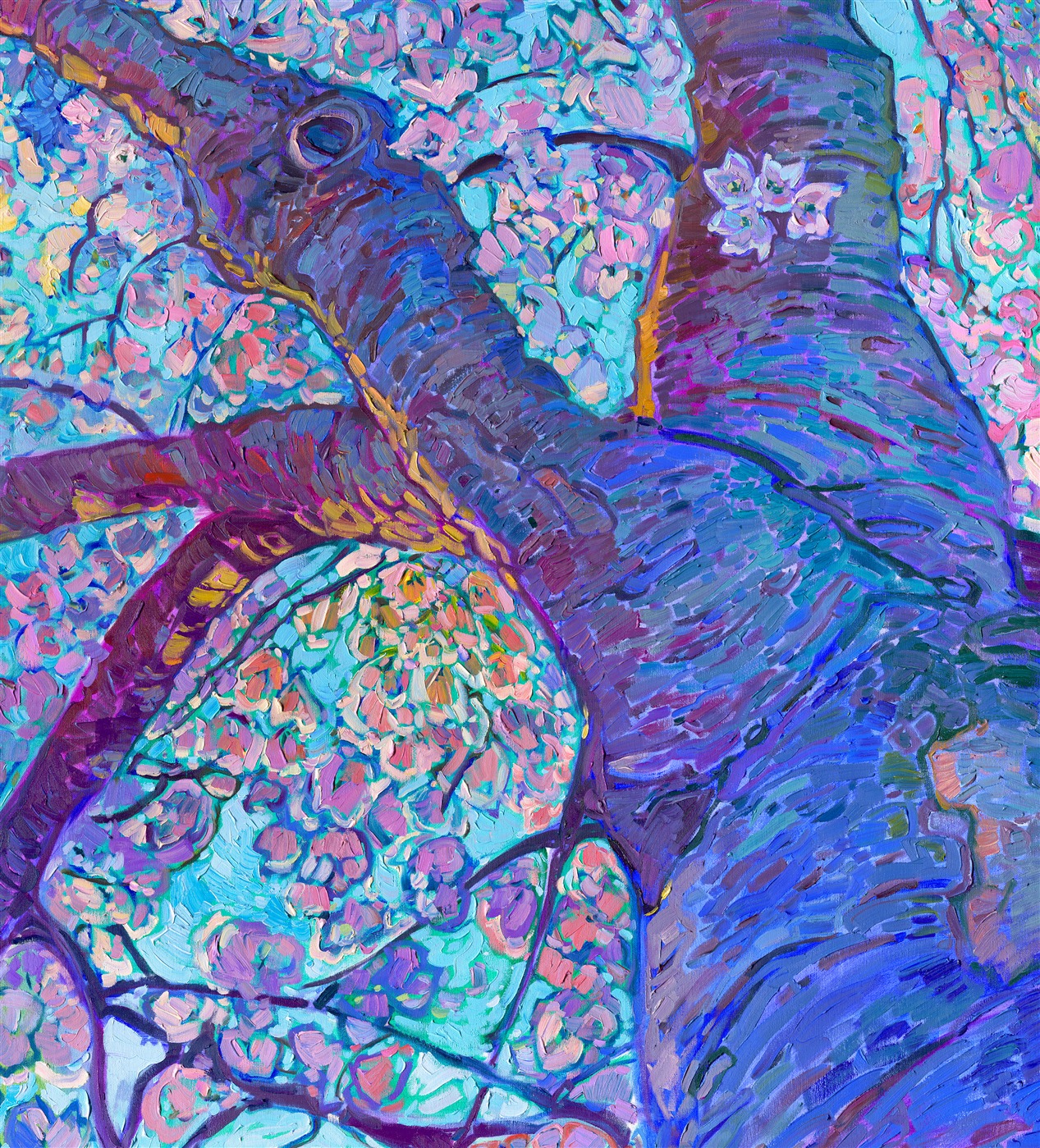 Framing: "Blooming Boughs" is an original oil painting created on 2"-deep canvas. The sides of the canvas are painted as a wrap-around continuation of the painting, and the piece is designed to hang un-framed. This painting will ship with heavy-duty cleat mounts so it will hang flush against the wall.
