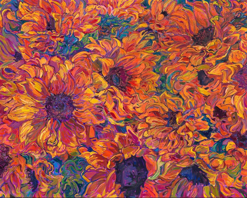 "Blooming Petals" is an original oil painting of sunflower blooms, by American impressionist Erin Hanson. Hailed as a modern van Gogh, Hanson captures the natural landscapes with bold color and thickly applied paint, in her iconic style "Open Impressionism."