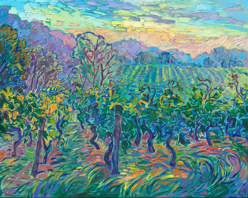 Note on varnishing: Erin’s paintings take six to eight weeks to dry, at which time we apply a retouching varnish, which allows the painting to complete the curing process while having a layer of protection against dirt and scuffs. The full curing process for an impasto oil painting takes at least two years. We are happy to assist in applying a final finishing varnish to your Erin Hanson oil painting once it has been dry for at least two years. Here is more information on how to care for your original oil painting.