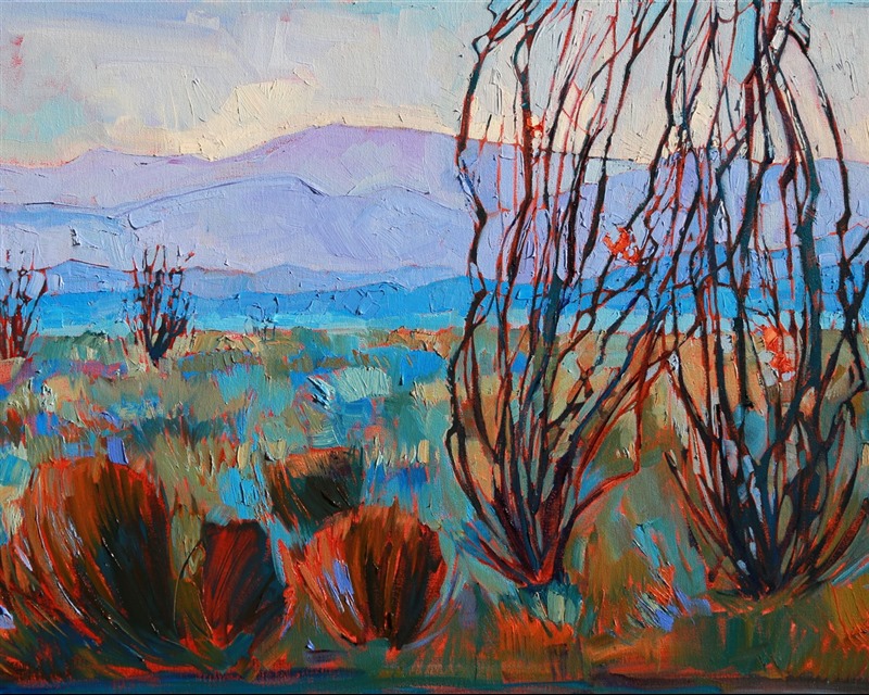 Note on varnishing: Erin’s paintings take six to eight weeks to dry, at which time we apply a retouching varnish, which allows the painting to complete the curing process while having a layer of protection against dirt and scuffs. The full curing process for an impasto oil painting takes at least two years. We are happy to assist in applying a final finishing varnish to your Erin Hanson oil painting once it has been dry for at least two years. Here is more information on how to care for your original oil painting.