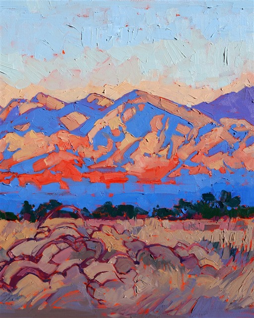 Note on varnishing: Erin’s paintings take six to eight weeks to dry, at which time we apply a retouching varnish, which allows the painting to complete the curing process while having a layer of protection against dirt and scuffs. The full curing process for an impasto oil painting takes at least two years. We are happy to assist in applying a final finishing varnish to your Erin Hanson oil painting once it has been dry for at least two years. Here is more information on how to care for your original oil painting.
