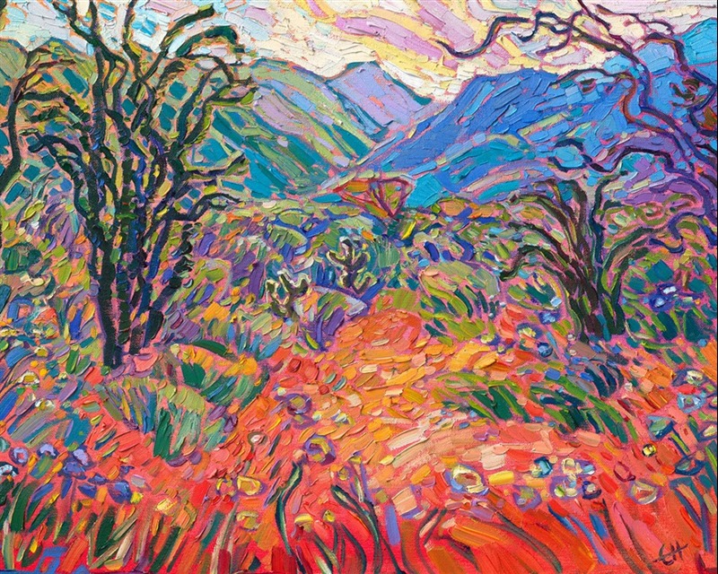 Style: "Open Impressionism" is a new style of painting developed by American artist Erin Hanson. The style is characterized by short, impasto brush strokes that are applied without layering, creating a mosaic or stained-glass appearance to the paintings. The paintings are created with a limited palette of colors, applied without blending or mixing upon the canvas, which adds a dimension of texture to each brush stroke. Inspired by classic impressionism, pointillism, and post-impressionism, Erin Hanson continues the tradition of impressionism into the modern day with her colorful and vivacious landscape paintings.