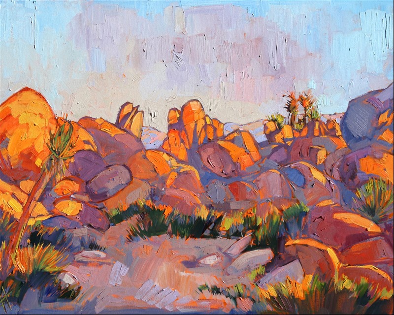 Multi-hued purple shadows lurk behind rounded granite boulders at Joshua Tree National Park, while the crimson light of sunset carves fire from the rocks. This painting is full of energy and motion, the brush strokes quick and alive.
