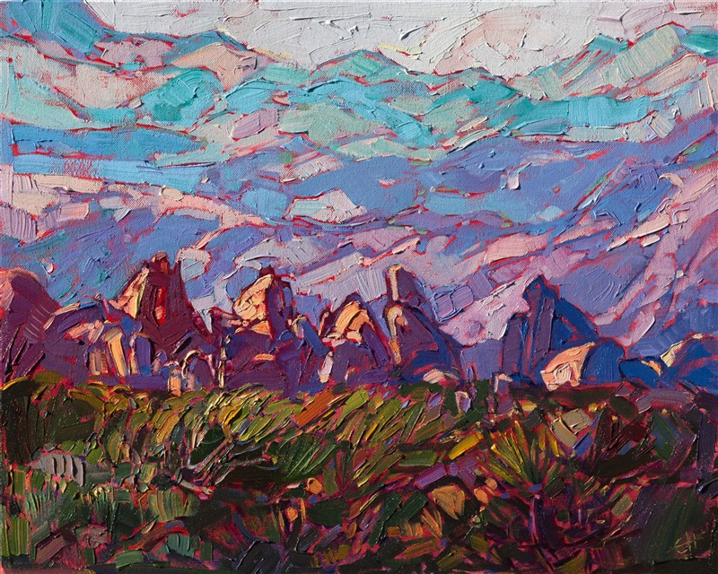 ERIN HANSON has been painting in oils since she was 8 years old. As a teenager, she apprenticed at a mural studio where she worked on 40-foot-long paintings while selling art commissions on the side. After being told it was too hard to make a living as an artist, she got her degree in Bioengineering from UC Berkeley. Afterward, Erin became a rock climber at Red Rock Canyon, Nevada. Inspired by the colorful scenery she was climbing, she decided to return to her love of painting and create one new painting every week.