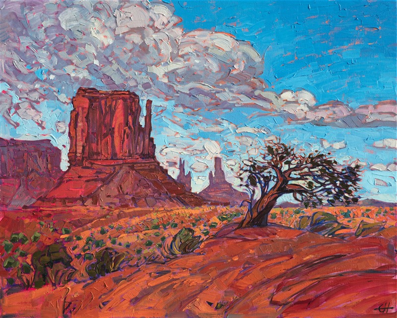 A wind-swept bristlecone pine stands guard over Monument Valley, home to some of the most striking rock formations in the Southwest. The multi-colored red earth is a dramatic contrast against the summer blue sky. The brush strokes in this painting are loose and impressionistic, creating a mosaic of color and texture across the canvas.