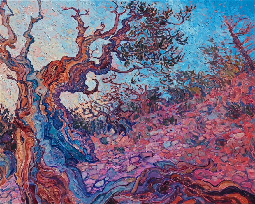 Style: "Open Impressionism" is a new style of painting developed by American artist Erin Hanson. The style is characterized by short, impasto brush strokes that are applied without layering, creating a mosaic or stained-glass appearance to the paintings. The paintings are created with a limited palette of colors, applied without blending or mixing upon the canvas, which adds a dimension of texture to each brush stroke. Inspired by classic impressionism, pointillism, and post-impressionism, Erin Hanson continues the tradition of impressionism into the modern day with her colorful and vivacious landscape paintings.