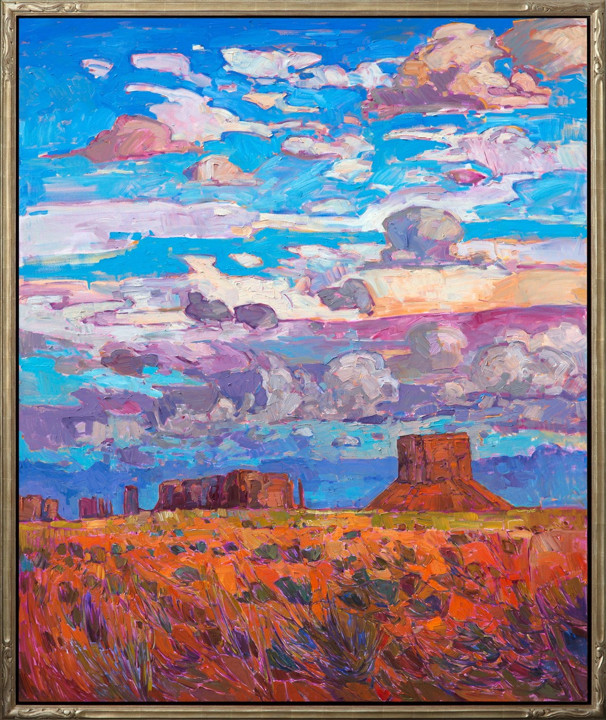 This painting was done on 1-1/2"-deep canvas, with the painting continued around the edges. Buttes and Sky has been framed in a hand-carved, gold leaf floater frame that was custom-made for this painting.