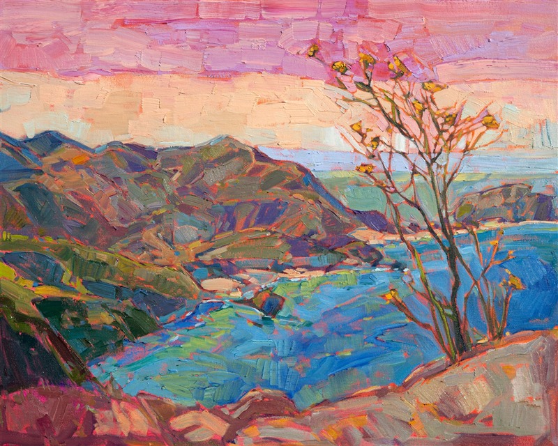 ERIN HANSON has been painting in oils since she was 8 years old. As a teenager, she apprenticed at a mural studio where she worked on 40-foot-long paintings while selling art commissions on the side. After being told it was too hard to make a living as an artist, she got her degree in Bioengineering from UC Berkeley. Afterward, Erin became a rock climber at Red Rock Canyon, Nevada. Inspired by the colorful scenery she was climbing, she decided to return to her love of painting and create one new painting every week.