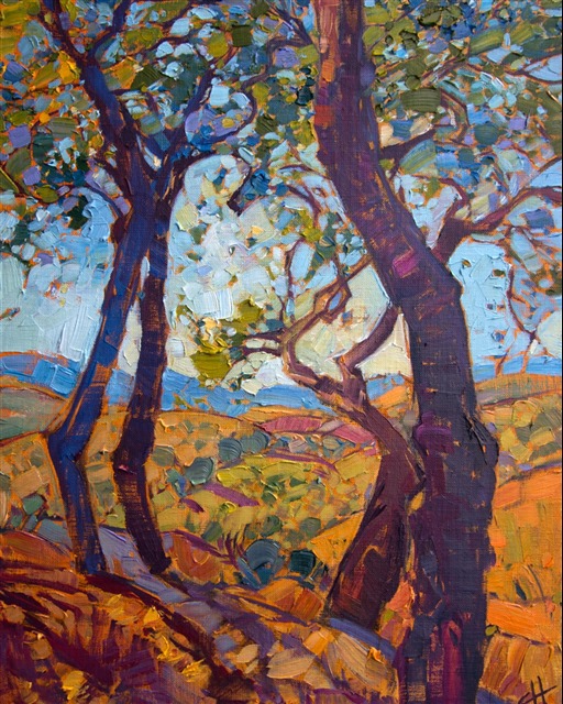 Style: "Open Impressionism" is a new style of painting developed by American artist Erin Hanson. The style is characterized by short, impasto brush strokes that are applied without layering, creating a mosaic or stained-glass appearance to the paintings. The paintings are created with a limited palette of colors, applied without blending or mixing upon the canvas, which adds a dimension of texture to each brush stroke. Inspired by classic impressionism, pointillism, and post-impressionism, Erin Hanson continues the tradition of impressionism into the modern day with her colorful and vivacious landscape paintings.
