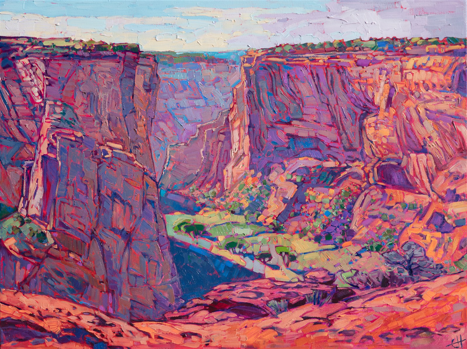 Lively color illuminates the canvas in this painting of Canyon de Chelly, Arizona. Early morning sun rays streak down the red rock cliffs and fill the canyon with glowing light. Impressionistic brush strokes capture the transience of the moment.