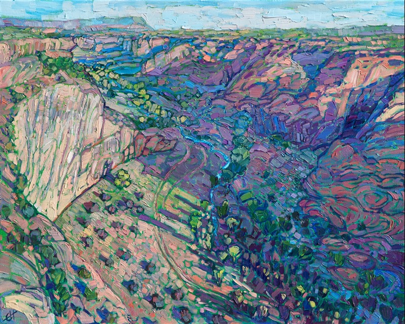 Warm light contrasts with rich shadows in this oil painting of Canyon de Chelly, Arizona. This painting was inspired by the view standing on the very edge of the canyon, looking down onto the winding river and cottonwood trees below. The painting captures the beautiful variety of color and textures you can find in the desert.