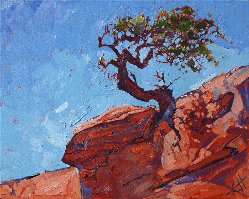 ERIN HANSON has been painting in oils since she was 8 years old. As a teenager, she apprenticed at a mural studio where she worked on 40-foot-long paintings while selling art commissions on the side. After being told it was too hard to make a living as an artist, she got her degree in Bioengineering from UC Berkeley. Afterward, Erin became a rock climber at Red Rock Canyon, Nevada. Inspired by the colorful scenery she was climbing, she decided to return to her love of painting and create one new painting every week.