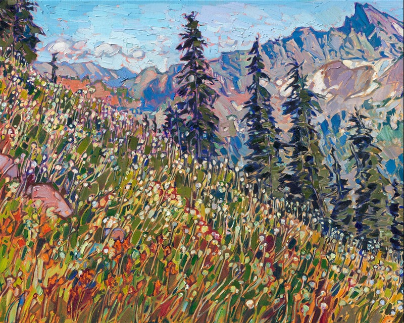 Style: "Open Impressionism" is a new style of painting developed by American artist Erin Hanson. The style is characterized by short, impasto brush strokes that are applied without layering, creating a mosaic or stained-glass appearance to the paintings. The paintings are created with a limited palette of colors, applied without blending or mixing upon the canvas, which adds a dimension of texture to each brush stroke. Inspired by classic impressionism, pointillism, and post-impressionism, Erin Hanson continues the tradition of impressionism into the modern day with her colorful and vivacious landscape paintings.