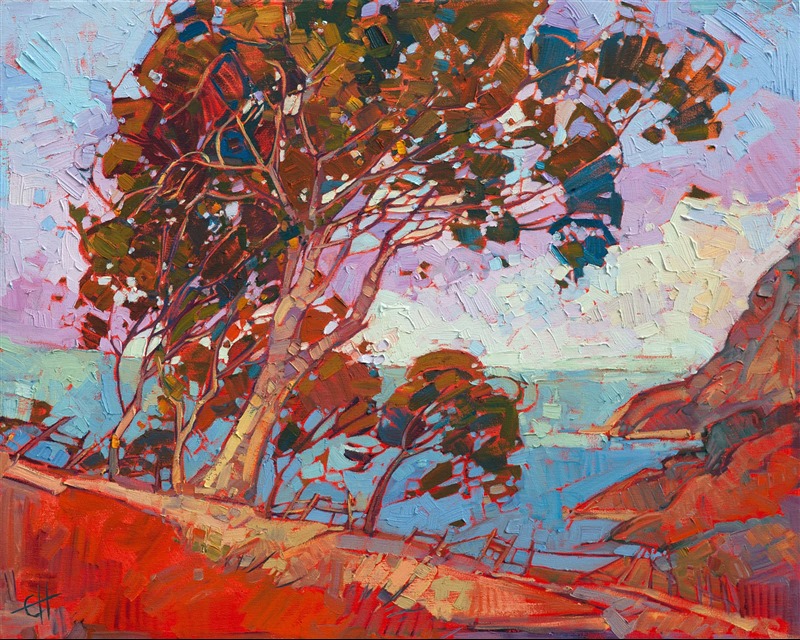 Catalina island has beautiful eucalyptus trees growing along the winding mountain roads. A burgundy red sunset makes the colors in the landscape come to life. Thick brush strokes create a lively contrast of color and motion throughout the painting.