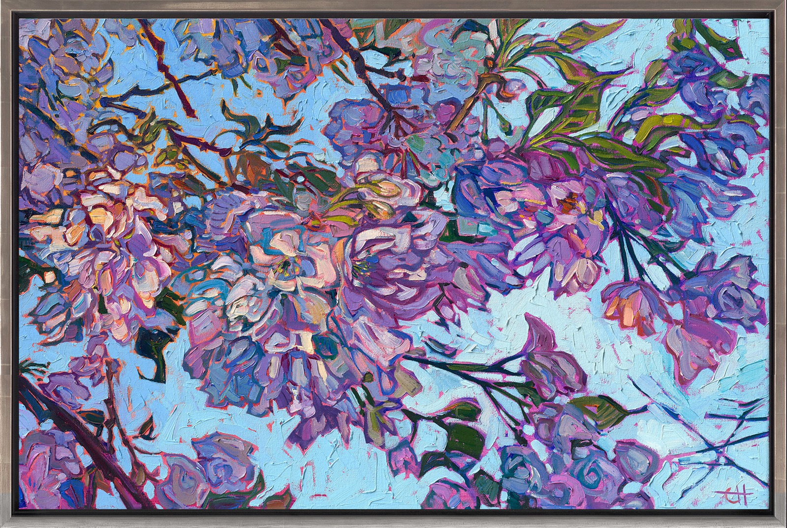 "Cherry Blossoms II" is an original oil painting created on stretched canvas. The piece arrives framed in a burnished silver floater frame, ready to hang.