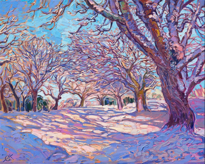 Framing: "Christmas Snow" is an original oil painting created by American impressionist Erin Hanson. This piece was painted on 1-1/2" stretched canvas, and it arrives framed and ready to hang in a silver floater frame finished in antiqued sterling leaf and dark, pebbled sides.